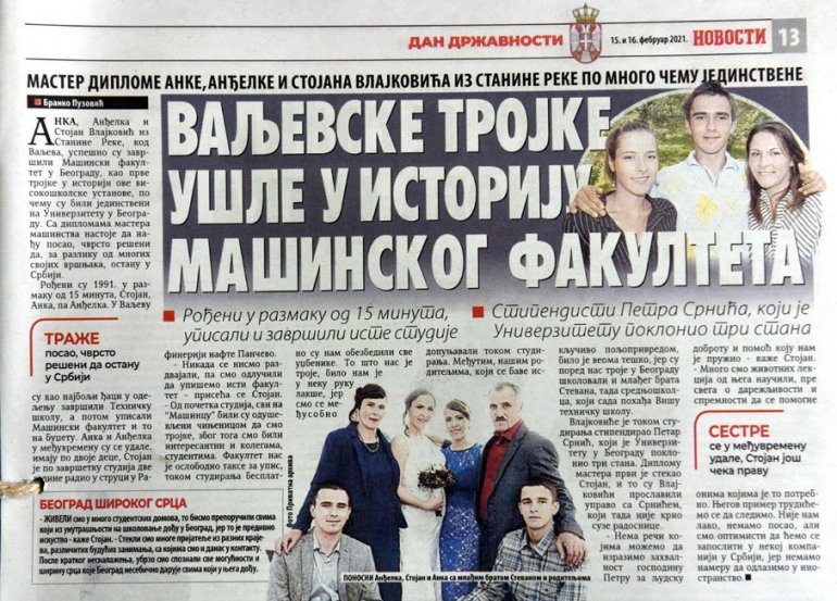 - Tata je u novinama pročitao tekst o trojkama porodice Vlajković, koje su zajedno upisali Mašinski fakultet. Bilo mu je dirljivo, jer su trojke retke i rešio je da ih potraži. Pronašao je Anđelku, Anku i Stojana i ponudio im je stipendiju.