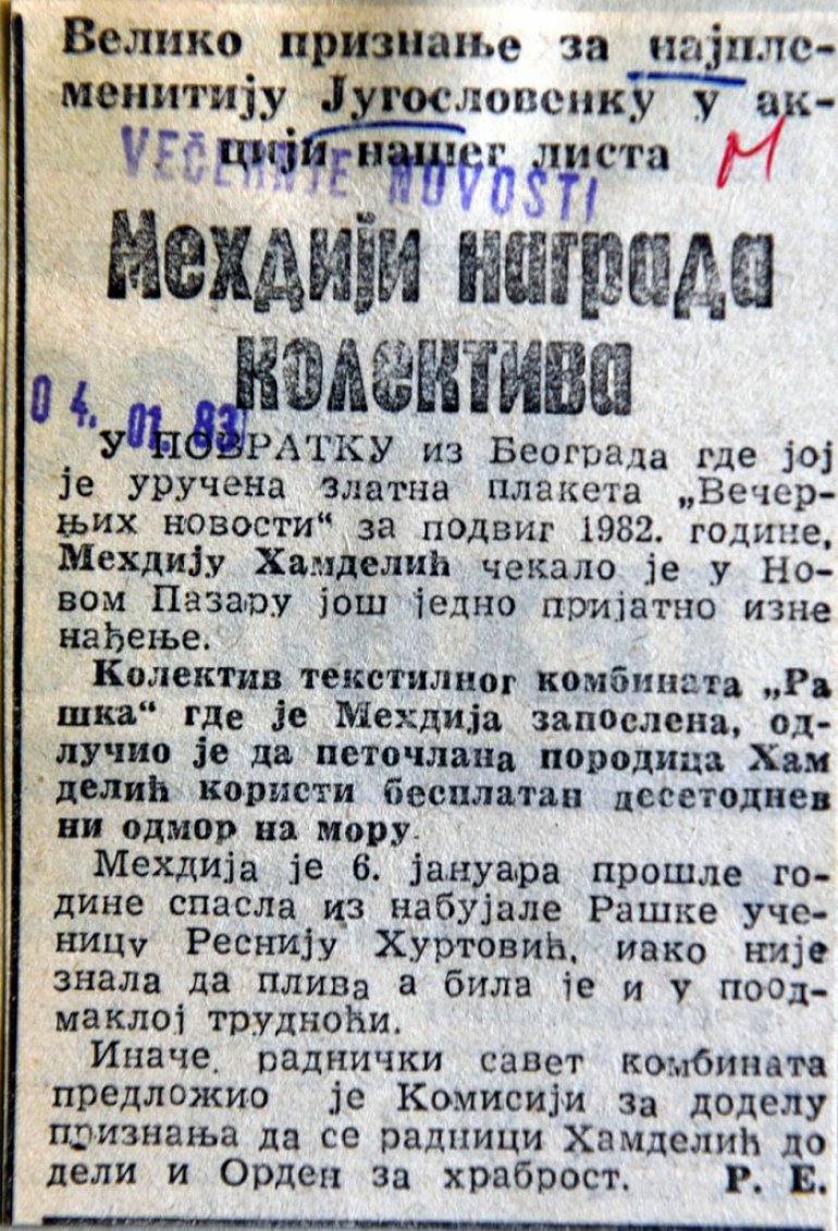Kada su Tanja Bošković i Miša Janketić, a Radio Beograd oglasio obrazloženje o podvigu žene koja je u osmom mesecu trudnoće skočila u ledenu reku da spase tuđe dete, svi su plakali. Samo je ona, Mehdija, suzu zamrzla kao onda kada je poletela u bujicu.
