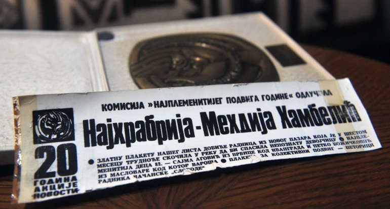 REČ po reč, danas, u kući Hambelića. Mehdijine oči zelene, krupne i blistave. Zasijaju kad govori dok iz ormara, gde se čuvaju dragocenosti za pokolenja, otpakuje plaketu "Novosti" za podvig. E, tek tada blaga suza krene.