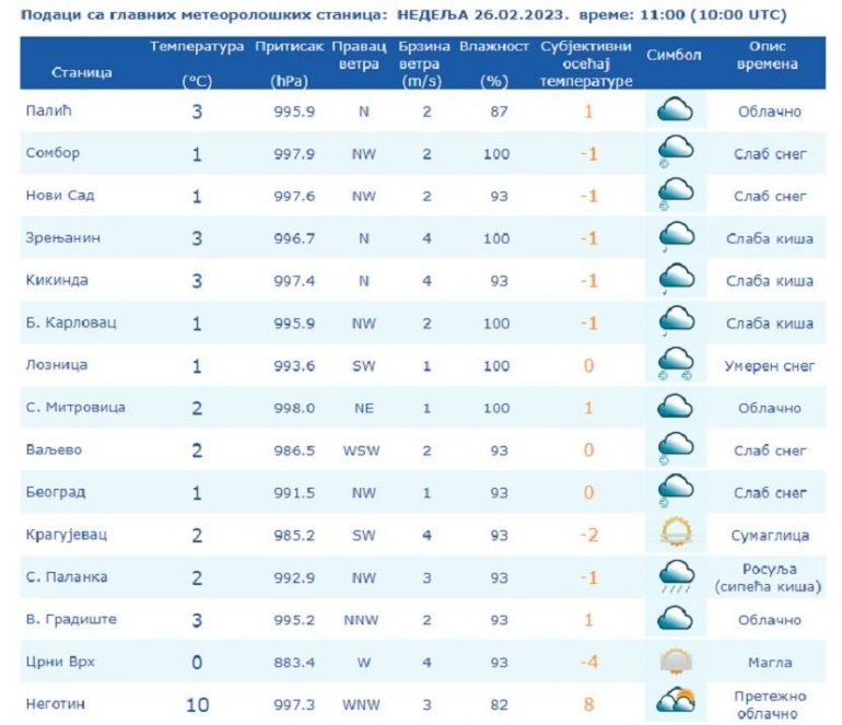Prema podacima na sajtu Republičkog hidrometeorolškog zavoda (RHMZ), u 11 sati najtopliji grad u Srbiji bio je Leskovac, gde je izmeren 21 stepen Celzijusa, a slede Dimitrovgrad i Vranje sa 18 stepeni.