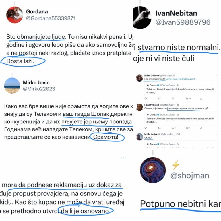 Ponašanje N1, Nove i Danasa, odnosno Dragana Šolaka i Junajted grupe, jedan “tviteraš” je najbolje opisao ovom porukom: “Kako vas, bre, više nije sramota da vodite ove kampanje?! Pa, svi znaju da su Telekom i vaš gazda Šolak direktna biznis konkurencija i da ih pljujete jer njemu propada kompanija. Godinama već napadate Telekom, kršite sve zakone i kodekse, a predstavljate se kao nezavisni. Sramota!”