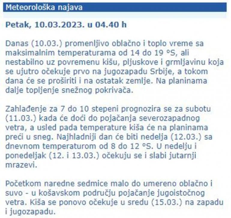 -Promenljiivo oblačno i toplo vreme očekuje se danas, sa maksimalnim temperaturama od 14 do 19°S, ali nestabilno uz povremenu kišu, pljuskove i grmljavinu koja se ujutro očekuje prvo na jugozapadu Srbije, a tokom dana će se proširiti i na ostatak zemlje. Na planinama dalje topljenje snežnog pokrivača. Zahlađenje za 7 do 10 stepeni prognozira se za sutra kada će doći do pojačanja severozapadnog vetra, a usled pada temperature kiša će na planinama preći u sneg. Najhladniji dan će biti nedelja sa dnevnom temperaturom od 8 do 12°S. U nedelju i ponedeljak očekuju se i slabi jutarnji mrazevi.