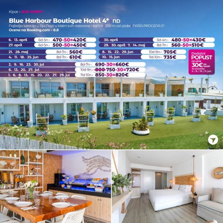 Predstavljamo vam hotel koji sredinom juna otvara svoja vrata za goste. U pitanju je potpuno nov hotel na odlicnoj lokaciji. Nalazi se u Aja Napi, na 15 minuta setnje od centra ovog mesta i u blizini plaze Vathia Gonia. U blizini hotela nalazi se brojni restorani, barovi i stanica gradskog prevoza. Hotel poseduje WiFi, bar kod recepcije, spoljasnji bazen i teretanu. Sobe su moderno opremljene, sa AC uređajem.