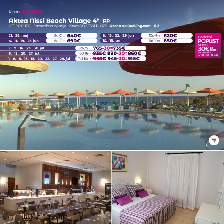 Ovaj objekat je udaljen 4 min hoda od plaže. Hotel Aktea Beach Village smešten je u Aja Napi, na 200 metara od plaže Nisi i peščane plaže. U ponudi ima elegantan smeštaj, osvetljen teniski teren i bazen sa prostranom sunčanom terasom i pogledom na more.Svi klimatizovani studiji i apartmani u hotelu Aktea Beach imaju dnevni boravak i čajnu kuhinju sa mikrotalasnom pećnicom i frižiderom. Sadrže takođe sef, fen za kosu i TV sa satelitskim kanalima. Tokom boravka se možete opustiti u klubu zdravlja, koji obuhvata zatvoreni bazen, tursko kupatilo i hidromasažnu kadu. Na raspolaganju su vam takođe sauna i potpuno opremljen fitnes centar, a najmlađi gosti se mogu zabavljati u dečijem klubu. Otvorena terasa je idealna za uživanje u piću iz bara u večernjim satima. U hotelskom restoranu služe se jela grčke i internacionalne kuhinje. U obližnjem centru Aja Nape možete pronaći brojne barove i restorane. Hotel takođe nudi besplatan bežični internet i besplatan parking u okviru objekta. Foto: Promo