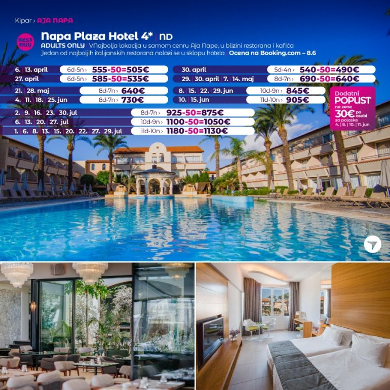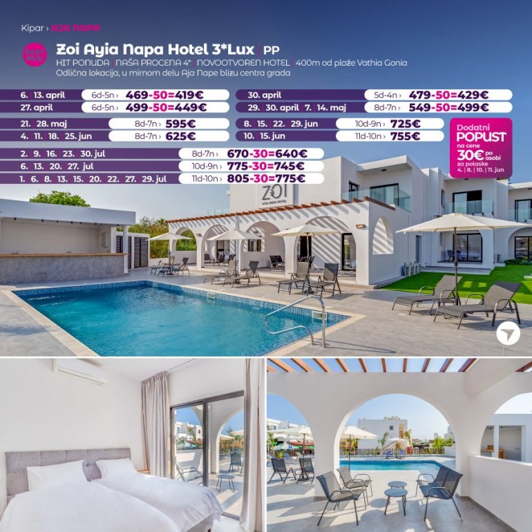 Predstavljamo vam hotel koji sredinom juna otvara svoja vrata za goste. U pitanju je potpuno nov hotel na odlicnoj lokaciji. Nalazi se u Aja Napi, na 15 minuta setnje od centra ovog mesta i u blizini plaze Vathia Gonia. U blizini hotela nalazi se brojni restorani, barovi i stanica gradskog prevoza. Hotel poseduje WiFi, bar kod recepcije, spoljasnji bazen i teretanu. Sobe su moderno opremljene, sa AC uređajem.
