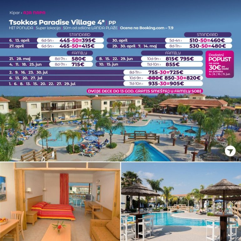 Ovo odmaralište sa 4 zvezdice nalazi se u letovalištu Aja Napa. Nudi zatvoreni bazen, fitnes centar, saunu i otvoreni bazen nepravilnog oblika, okružen nameštenom terasom za sunčanje. Sadržaji odmarališta Tsokkos Paradise takođe obuhvataju restoran-bar pored bazena, igraonicu sa bilijarom, teniski teren i mini-market. Smeštajne jedinice u odmaralištu Tsokkos Paradise imaju balkon sa pogledom na bazen. Pored kupatila sa fenom za kosu i besplatnim toaletnim priborom, svaka smeštajna jedinica sadrži dobro opremljenu čajnu kuhinju sa trpezarijskim stolom, pločama za kuvanje, frižiderom i električnim kuvalom. Na raspolaganju je i TV sa satelitskim kanalima. Gosti se mogu opustiti u ležaljkama pored bazena i uživati u osvežavajućim pićima iz snek bara. Za najmlađe goste obezbeđeno je dečje igralište. Odmaralište takođe raspolaže dečjim klubom, salonom i opremom za stoni tenis. Recepcija odmarališta Tsokkos Paradise radi 24 sata dnevno, a osoblje pruža usluge konsijerža i menjačnice. Posluga u sobi i lanč paketi takođe se mogu organizovati.