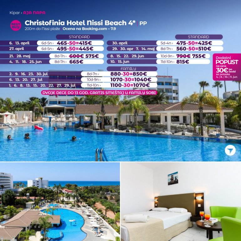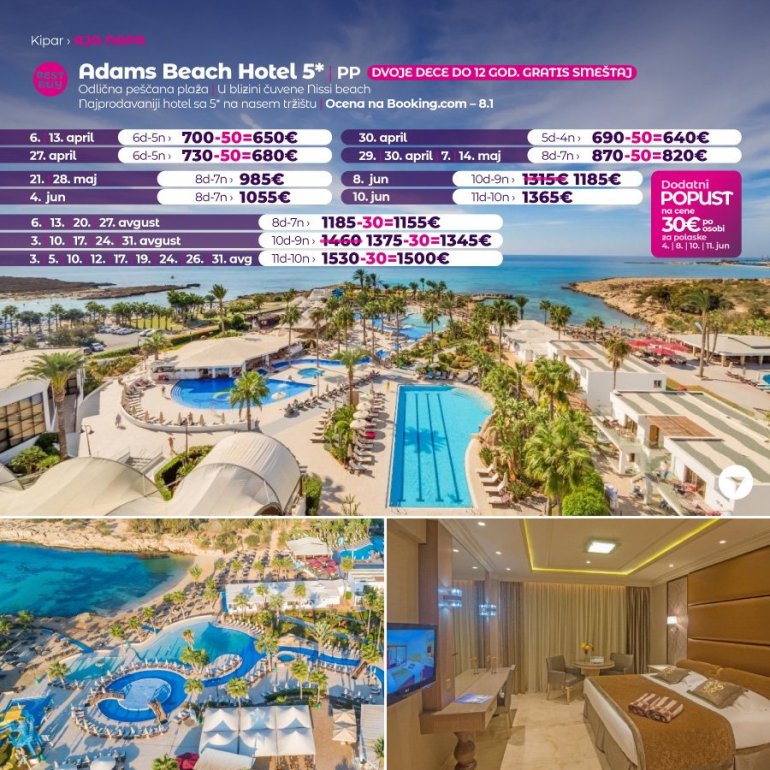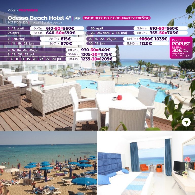 Definitivno nova omiljena letnja destinacija naših turista, svakako jeste rajsko ostrvo Kipar. Osetite čari Mediterana, fantastičnih plaža, veoma kvalitetnih hotela, izuzetne gastronomske ponude, kao i nezaboravnog noćnog provoda. Za naše putnike smo spremili odličnu first minute ponudu sa pažljivo izabranim hotelima, kako na osnovu pređašnjih iskustava naših klijenata, tako i na osnovu odličnih ocena na turističkim portalima.