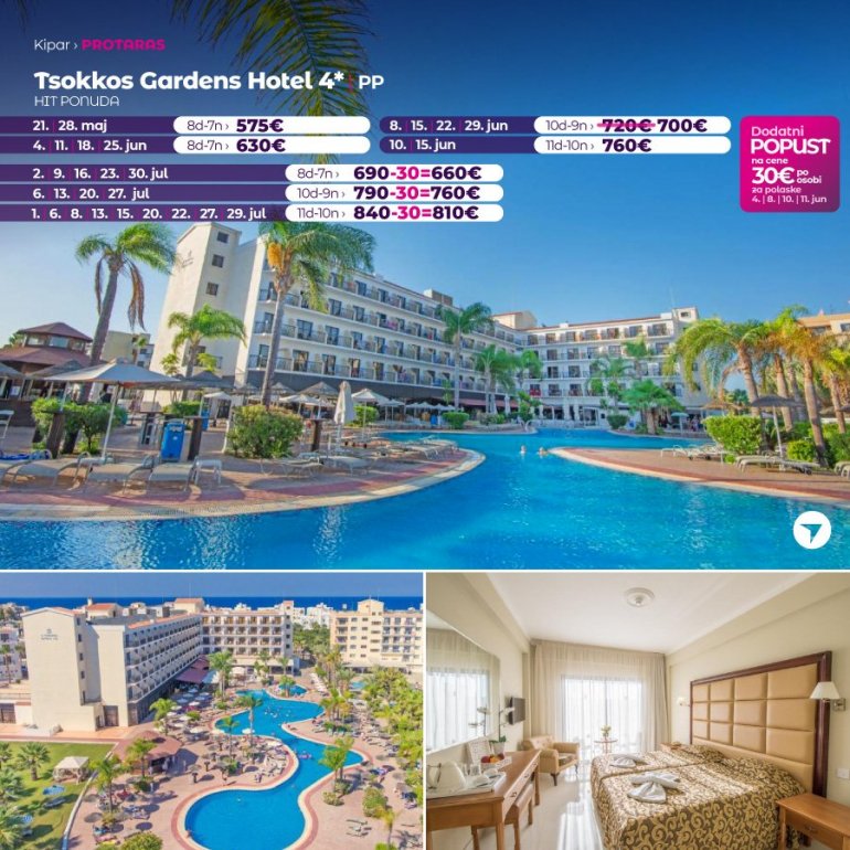 Ovaj objekat je udaljen 10 min hoda od plaže. Smešten u Protarasu, objekat Tsokkos Gardens Hotel nudi otvoreni bazen sa zasebnim delom za decu i terasu za sunčanje sa nameštajem na otvorenom. Hotel je udaljen 800 metara od plaže Sanrajz (Sunrise). Plaža Kalamies udaljena je 2,5 km, a plaža Konos 3,8 km. Sve klimatizovane sobe imaju telefon, balkon i TV sa satelitskim kanalima. Do soba se dolazi liftom. Kupatilo je opremljeno fenom za kosu i tušem. Hotel Tsokkos Gardens ima bar i à-la-carte restoran koji, takođe, sprema specijalne menije za decu. Gosti svakog jutra mogu da uživaju u doručku. Objekat ima recepciju koja radi non-stop. Usluga čuvanja dece je dostupna na zahtev. Tretmani masažom mogu da se organizuju. Na raspolaganju su teniski teren, sauna, hamam i hidromasažna kada. Javni parking na licu mesta može besplatno da se koristi.