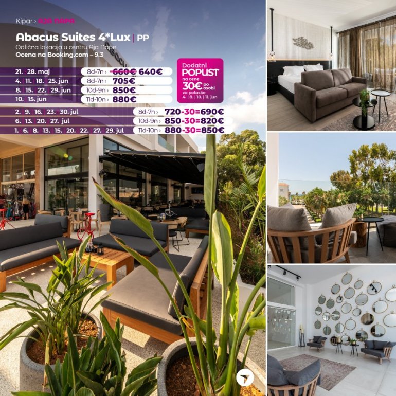 Abacus Suites je potpuno nov hotel, sa najvišim ocenama na turističkim portalima. Izuzetno je lociran, na nekoliko minuta hoda od centra Aja Nape i plaže. U neposrednoj blizini hotela nalaze se restorani, kafići, barovi, prodavnice i stanica gradskog prevoza. Idealan je izbor kako za parove, tako i za porodice, zbog prostranih soba i usluge koja može biti polupansion ili all inclusive. Restoran, bazeni (spoljašnji, unutrašnji i dečiji), bar, odličan fitness centar, sauna, tursko kupatilo, teniski teren i SPA centar nalaze se u hotelu Anmaria Beach 4*, pored hotela Abacus Suites. Sve sobe su moderno uređene, klimatizovane, sa besplatnom wi-fi konekcijom, imaju balkon, sef, peškire za plažu (uz depozit koji se vraća na kraju boravka), SAT TV, mini frižider, telefon, fen i ketler. Foto: Promo