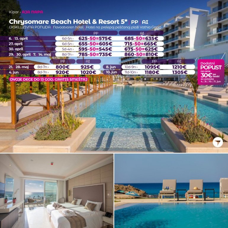 Od novosagrađenih hotela u Aja Napi (2019/2020 god.), Chrysomare Beach Hotel & Resort, s pravom se može svrstati među najluksuznije i najbolje pozicionirane hotele. Izgrađen je na početku jedne od najlepših peščanih uvala Vathia Gonia, na samo kilometar od centra grada. Hotel ima brojne sadržaje: glavni restoran u kome se služe specijaliteti lokalne i internacionalne kuhinje, italijanski restoran, grčku tavernu, azijski restoran, pet barova, nekoliko bazena (unutrašnji bazen, veliki spoljašnji bazen sa toboganima, dečiji bazen...), luksuzni Spa centar sa masažama, đakuzijem, pedikir/manikir salonom, frizerskim salonom i velikom teretanom. Celodnevna zabava je organizovana za sve uzraste (mini klub, program za tinejdžere, animacija za odrasle) i završava se u kasnim večernjim časovima folklornim nastupima, muzičkim predstavama ili plesom. Sve sobe su klimatizovane, imaju balkon ili terasu, SAT TV, telefon sa direktnom linijom, ketler, sef, mini frižider, fen i toaletni pribor. Bežični internet je dostupan u svim delovima hotela.