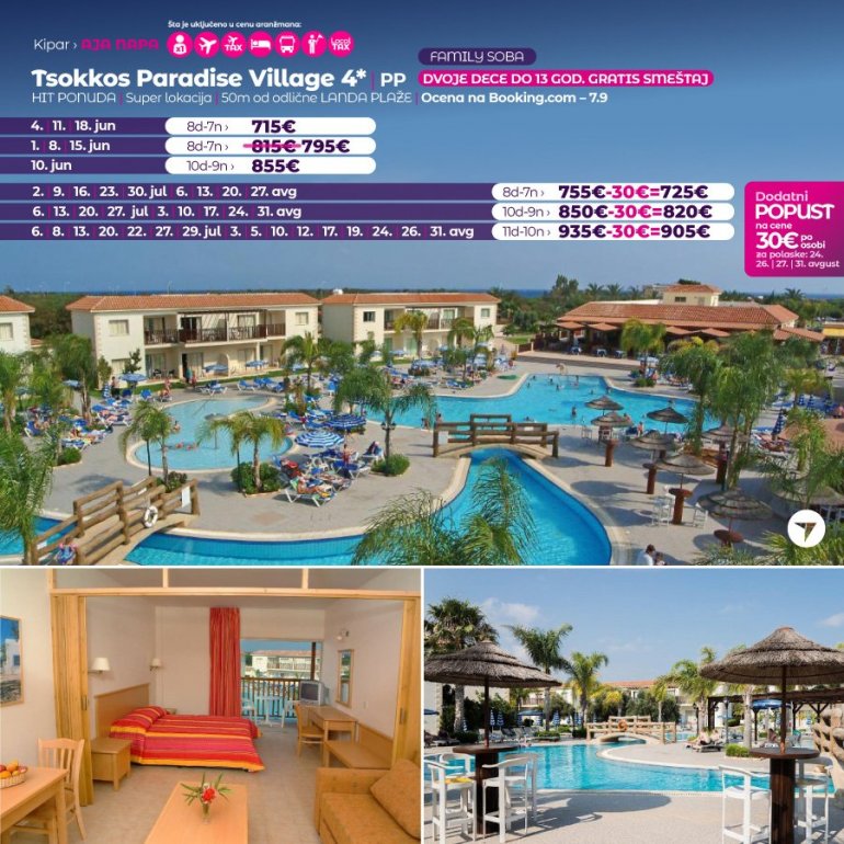 Ovo odmaralište sa 4 zvezdice nalazi se u letovalištu Aja Napa. Nudi zatvoreni bazen, fitnes centar, saunu i otvoreni bazen nepravilnog oblika, okružen nameštenom terasom za sunčanje. Sadržaji odmarališta Tsokkos Paradise takođe obuhvataju restoran-bar pored bazena, igraonicu sa bilijarom, teniski teren i mini-market. Smeštajne jedinice u odmaralištu Tsokkos Paradise imaju balkon sa pogledom na bazen. Pored kupatila sa fenom za kosu i besplatnim toaletnim priborom, svaka smeštajna jedinica sadrži dobro opremljenu čajnu kuhinju sa trpezarijskim stolom, pločama za kuvanje, frižiderom i električnim kuvalom. Na raspolaganju je i TV sa satelitskim kanalima. Gosti se mogu opustiti u ležaljkama pored bazena i uživati u osvežavajućim pićima iz snek bara. Za najmlađe goste obezbeđeno je dečje igralište. Odmaralište takođe raspolaže dečjim klubom, salonom i opremom za stoni tenis. Recepcija odmarališta Tsokkos Paradise radi 24 sata dnevno, a osoblje pruža usluge konsijerža i menjačnice. Posluga u sobi i lanč paketi takođe se mogu organizovati.
