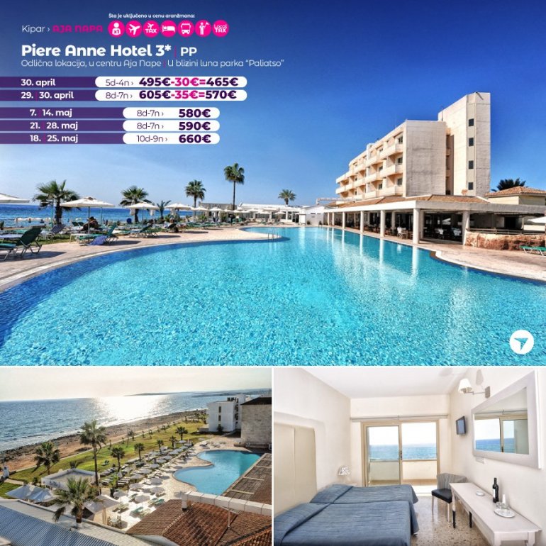 Hotel Piere Anne ima odličnu lokaciju na obali mora, na 5 minuta od centra Aja Nape i na 5 minuta od luke i plaže. Zabavni park Parko Paliatso Fun se takođe nalazi odmah iza hotela, zajedno sa čuvenom ulicom Nissi Avenue. U neposrednoj blizini nalaze se prodavnice, barovi i restorani, a svi sadržaji Aja Nape su na dohvat ruke. Hotel Piere Anne se sastoji od 3 bloka soba sa 2 velika otvorena bazena. Bazeni imaju direktan pristup stazi uz more, a bar pored bazena "En Plo" je odlično mesto za opuštanje tokom dana. Iako hotel nema mnogo sadržaja na licu mesta, Piere Anne je toliko blizu svega u Aja Napi da je odlična baza za zabavu na plaži ili provod u klubovima., kao i odmor uz Mediteran.