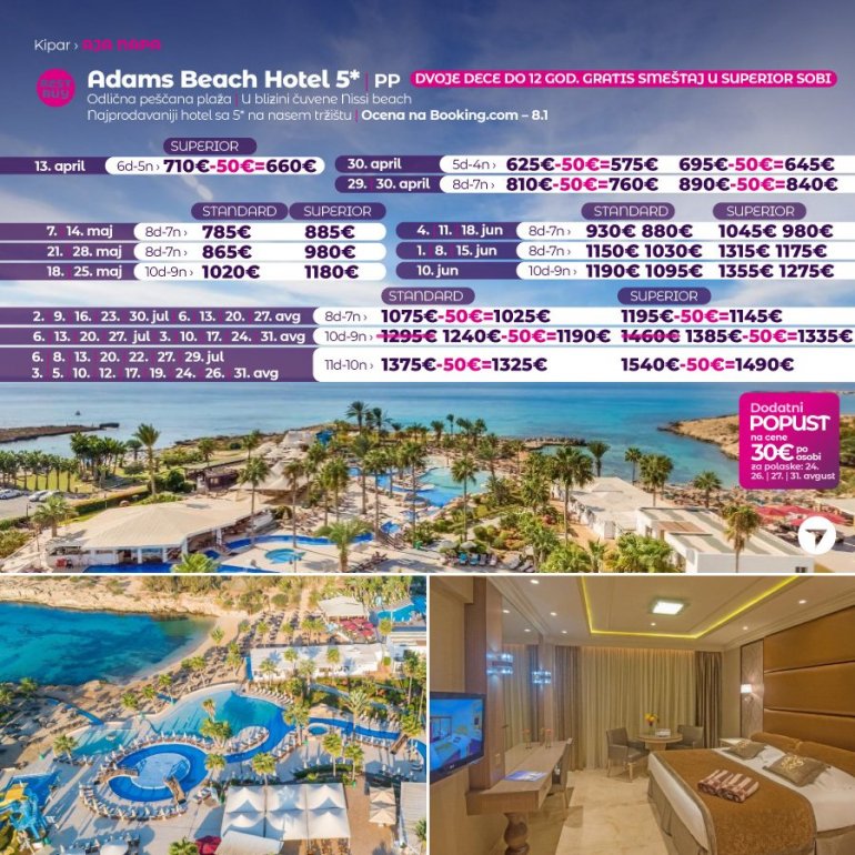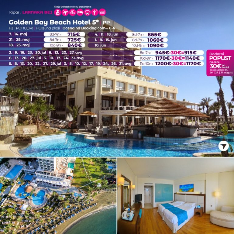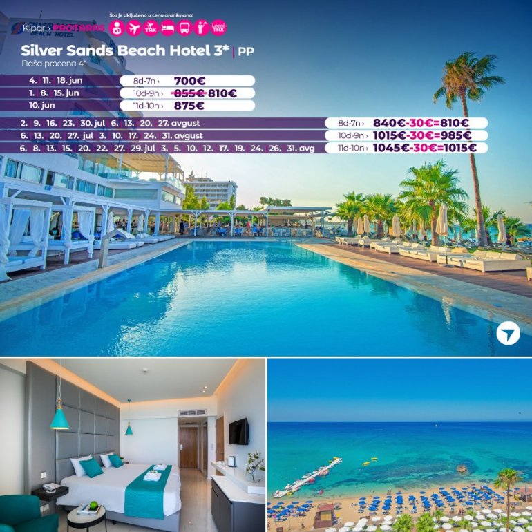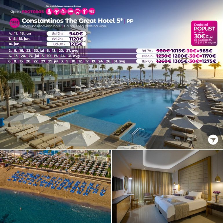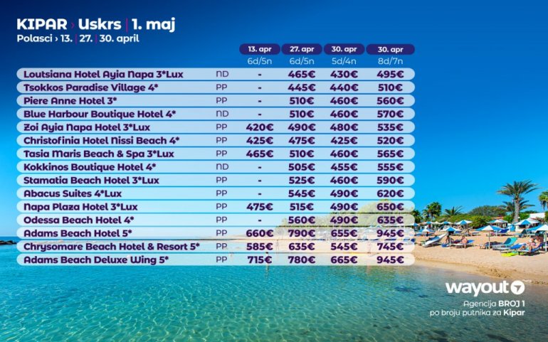Definitivno nova omiljena letnja destinacija naših turista, svakako jeste rajsko ostrvo Kipar. Osetite čari Mediterana, fantastičnih plaža, veoma kvalitetnih hotela, izuzetne gastronomske ponude, kao i nezaboravnog noćnog provoda. Za naše putnike smo spremili odličnu first minute ponudu sa pažljivo izabranim hotelima, kako na osnovu pređašnjih iskustava naših klijenata, tako i na osnovu odličnih ocena na turističkim portalima.