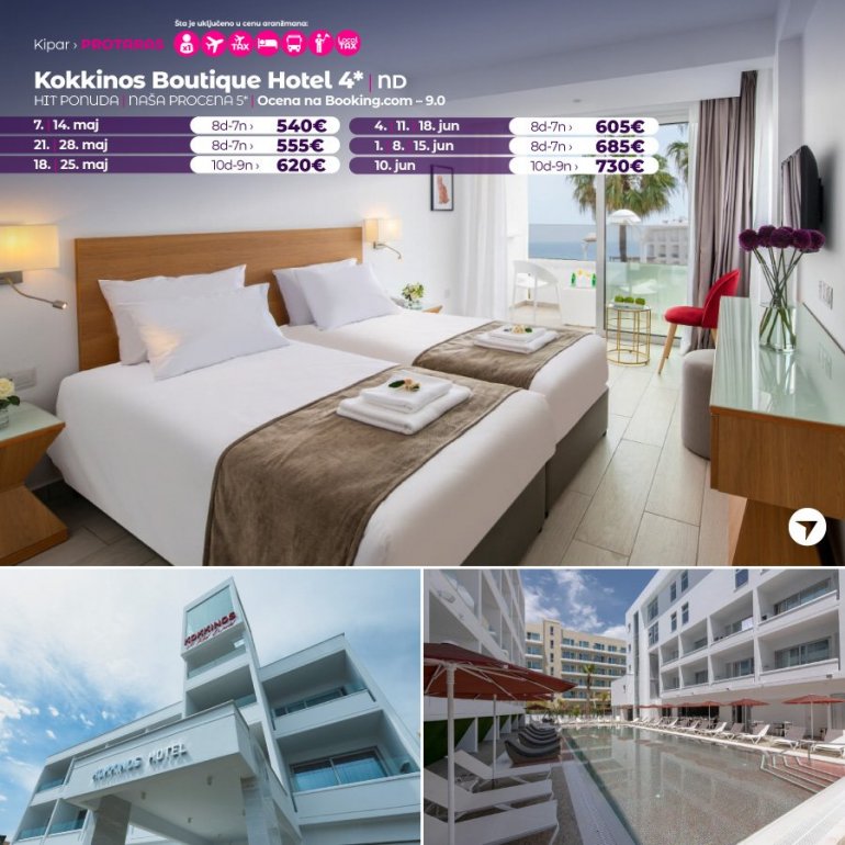 Potpuno nov hotel, izuzetno lociran u samom centru Protarasa, okružen mnoštvom restorana, kafića i prodavnica. Namenjen je svima koji vole vrhunski dizajniran interijer, sa crvenim detaljima odakle i potiče ime ovog šarmantnog hotela (kokkinos= crveno). Prilikom opremanja hotela se vodilo računa i o originalnim rešenjima, pa je tako veliki bazen crvene boje i potpuno je jedinstveno dizajnersko rešenje na celom Kipru. Najlepša plaža u Protarasu, Fig Tree bay Beach, udaljena je od hotela 150 m, kao i pešačka staza uz obalu koja se proteže duž celog Protarasa. Sve sobe su zvučno izolovane i klimatizovane, imaju balkon, kupatilo sa tuš kabinom i toaletnim priborom, peškire za plažu, fen, ketler, Flat SAT TV, telefon sa direktnom linijom, mini frižider, sef (uz doplatu), wi-fi konekciju (bez doplate). U restoranu se služi kontinentalni doručak, a gosti koji žele polupansion, mogu večeru da koriste u obližnjem hotelu "ILIADA 3*".