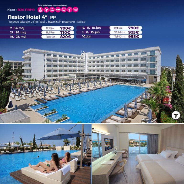 Moderan i u potpunosti renoviran hotel Nestor, odlično je pozicioniran na samo nekoliko minuta šetnje do prelepe peščane plaže, marine i centra Aja Nape. Visoko je ocenjen na turističkim potralima i dobitnik je prestižne plakete za visok kvalitet usluge. Hotel od sadržaja ima: veliki spoljašnji bazen sa masažerima, unutrašnji bazen, teretanu, saunu, parno kupatilo, stoni tenis, teniski teren, bilijar, frizerski salon, dnevnu i večernju animaciju za odrasle, sadržaje za decu – bazen, avantura park, rane obroke, animaciju, mini klub. Sobe su moderno opremljene, klimatizovane, imaju radio, fen, telefon, SAT LCD TV, frižider, sef, aparat za čaj i kafu, wi-fi internet (dostupan i besplatan u celom hotelu).