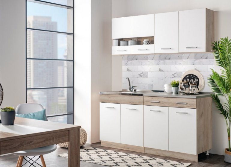 Opremanje malih kuhinja i ograničenog trpezarijskog prostora može biti veliki izazov, a tokom ove mesečne akcije Forma Ideale vam među artiklima sa najboljim cenama nudi kuhinju DALILA 160 (160 cm širine), u kombinaciji sivog hrasta i opak belog dezena. Svojim dizajnom koji je u skladu sa trendovima u enterijeru učiniće ambijent prijatnim i praktično organizovanim. U ovu kuhinju možete odlično uklopiti i trpezarijski sto DT 80x80 u belom dekoru, po ceni od 6.990 dinara.