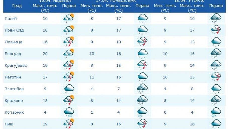 I narednih dana očekuje nas nestabilno s čestom kišom, pljuskovima i grmljavinom (na visokim planinama i sa snegom). Maksimalna temperatura u većini mesta od 14 do 20 °S.