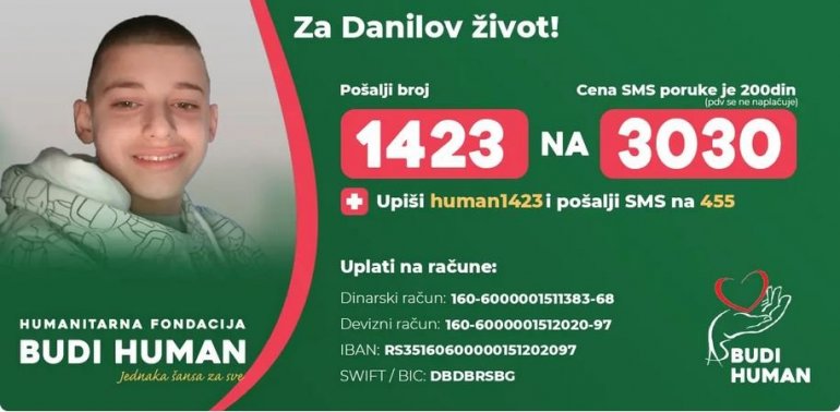 Za nastavak Danilovog lečenja u inostranstvu neophodna su značajna finansijska sredstva koja Danilova samohrana majka nije u mogućnosti samostalno da obezbedi pa joj je potrebna pomoć svih ljudi dobre volje kako bi pomogli Danilu da pobedi opaku bolest i iz ove borbe izađe kao pobednik.