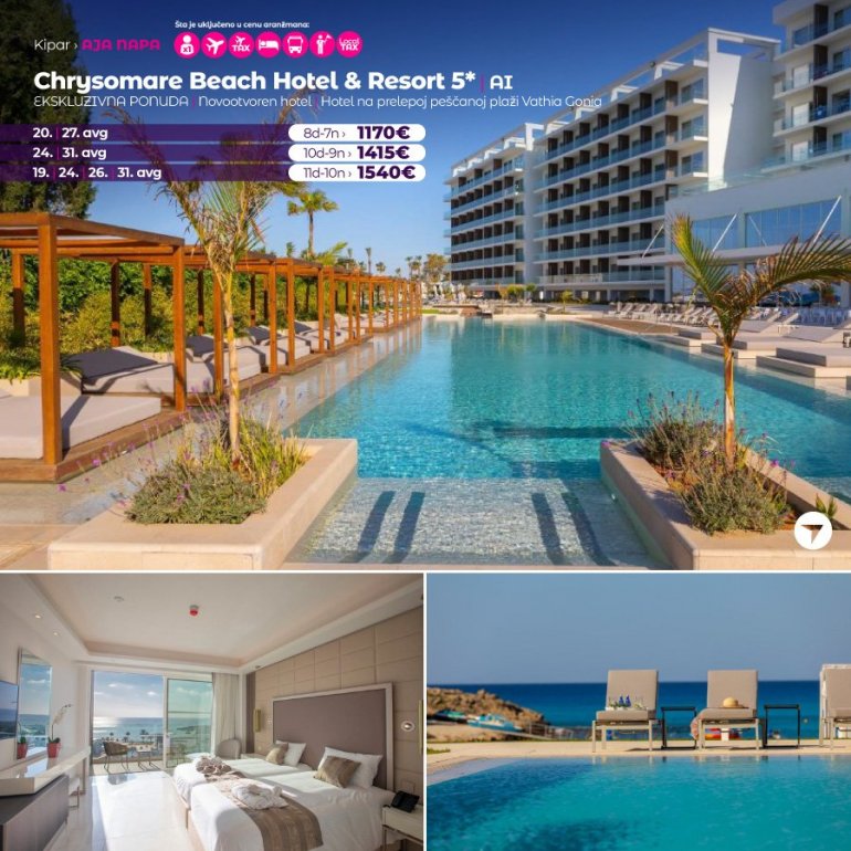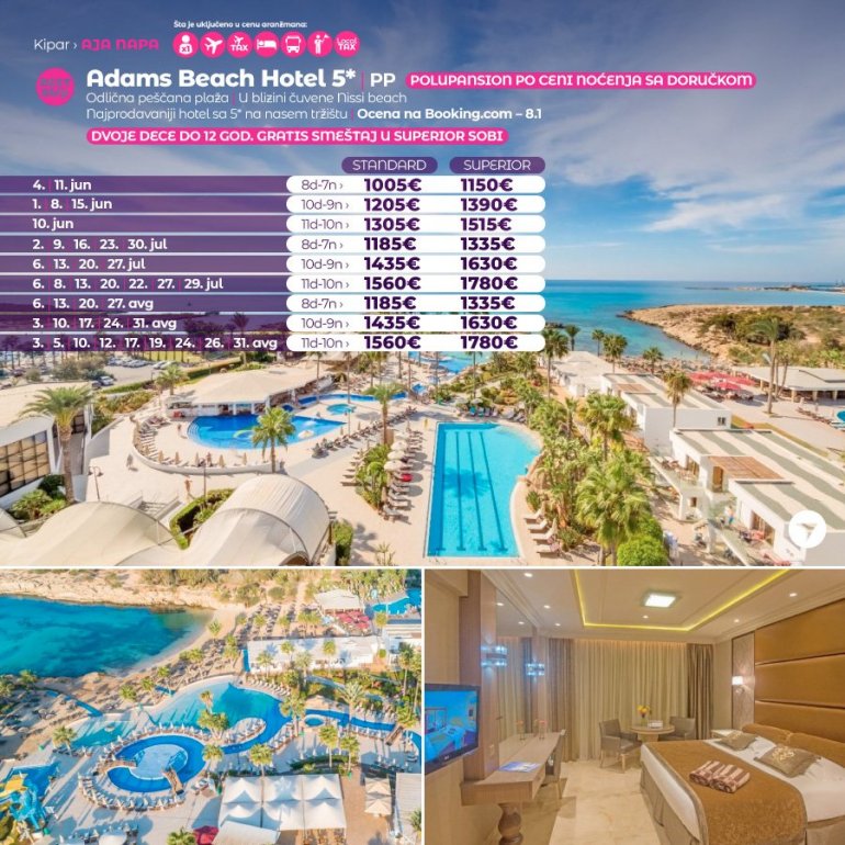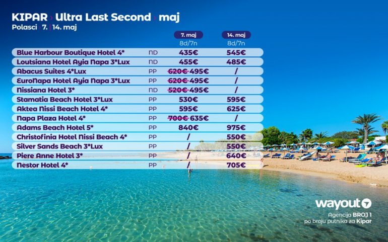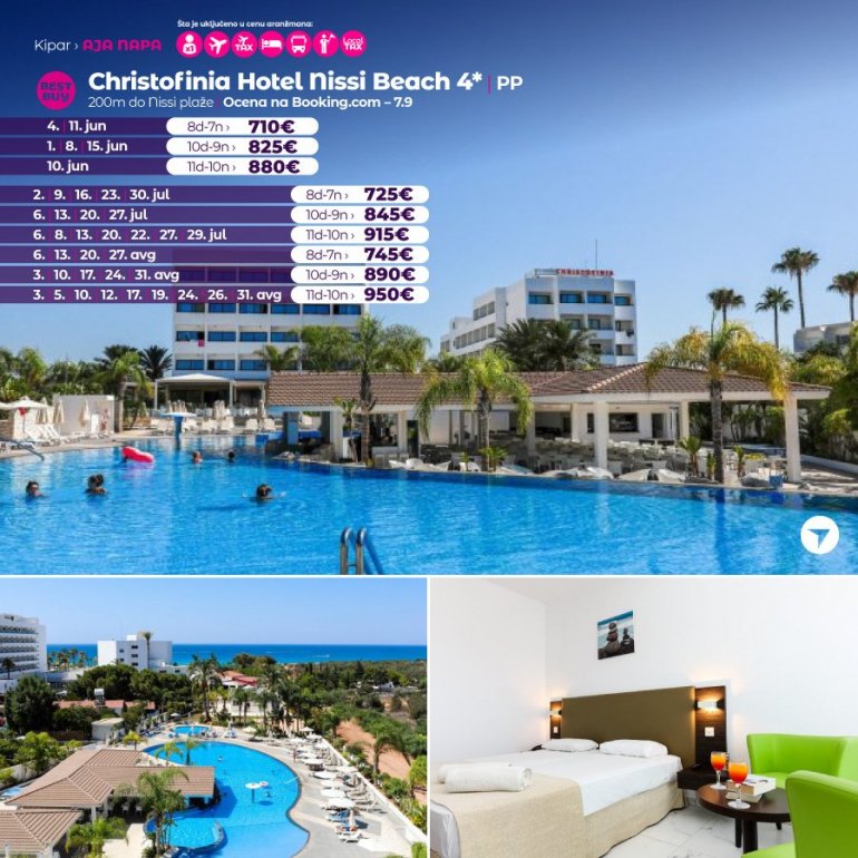 Definitivno nova omiljena letnja destinacija naših turista, svakako jeste rajsko ostrvo Kipar. Osetite čari Mediterana, fantastičnih plaža, veoma kvalitetnih hotela, izuzetne gastronomske ponude, kao i nezaboravnog noćnog provoda. Za naše putnike smo spremili odličnu first minute ponudu sa pažljivo izabranim hotelima, kako na osnovu pređašnjih iskustava naših klijenata, tako i na osnovu odličnih ocena na turističkim portalima.