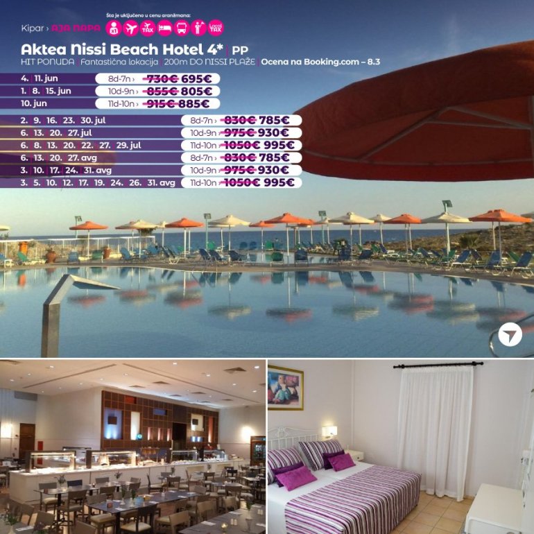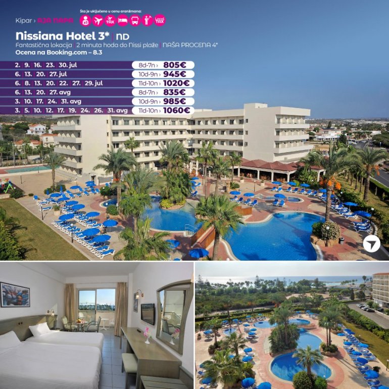 Vremešni, ali odlično održavan kompleks Nissiana, sastoji se od hotelske zgrade i bungalova, na nekoliko minuta hoda od najpoznatije plaže u Aja Napi – Nisi plaže. Hotel ima oko 170 soba, a bungalovski kompleks ima 33 smeštajne jedinice tipa studio (namenjen za najviše tri osobe) i tipa apartman (za četiri osobe). Do centra grada se može stići stazom uz obalu ili glavnom ulicom, za oko pola sata hoda, ili gradskim prevozom koji staje nedaleko od hotela.