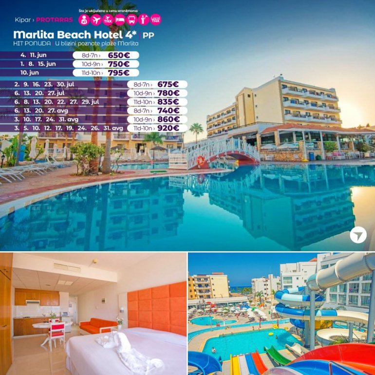 Hotel se nalazi na Marlita plaži, u regiji Pernera, na 15 minuta hoda od centra Protarasa. Marlita Beach Hotel Apartments nudi otvoren bazen, terasu za sunčanje sa poglednom na more i mediteranski restoran. Apartmani i studiji su moderno uređeni, sa čajnom kuhinjom i prostorom za sedenj. U sklopu smeštajnih jedinica nalazi se i kupatilo sa kadom, toaletnim priborom i fenom za kosu. SAT TV i sef su dostupni. Gosti mogu da koriste hotelski restoran i vodeni park koji se nalazi na nekoliko minuta hoda od hotela. Za decu su tu igrališe, dečiji bazen i oprema za igru na otvorenom. Od plaže Trinity smeštaj je udaljen oko 2.5km, dok je od aerodroma Larnaka udaljen 47km.