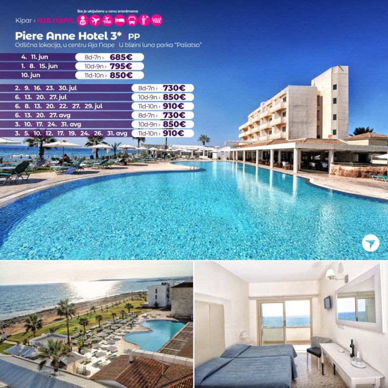 Hotel Piere Anne ima odličnu lokaciju na obali mora, na 5 minuta od centra Aja Nape i na 5 minuta od luke i plaže. Zabavni park Parko Paliatso Fun se takođe nalazi odmah iza hotela, zajedno sa čuvenom ulicom Nissi Avenue. U neposrednoj blizini nalaze se prodavnice, barovi i restorani, a svi sadržaji Aja Nape su na dohvat ruke. Hotel Piere Anne se sastoji od 3 bloka soba sa 2 velika otvorena bazena.Bazeni imaju direktan pristup stazi uz more, a bar pored bazena "En Plo" je odlično mesto za opuštanje tokom dana. Iako hotel nema mnogo sadržaja na licu mesta, Piere Anne je toliko blizu svega u Aja Napi da je odlična baza za zabavu na plaži ili provod u klubovima., kao i odmor uz Mediteran.