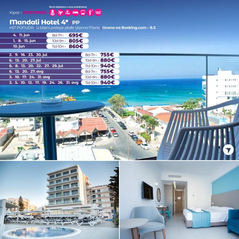 Ovaj objekat je udaljen 4 min hoda od peskovite plaže u Protarasu. Takođe, hotel poseduje i spoljašnji i unutrašnji bazen sa ležaljkama. Svaka soba u Mandali hotelu sadrži: ketler, mini frižider, tv i privatni balkon. U kupatilima se nalazi fen. U hotelu je dostupan restoran sa lokalnim specijalitetima. Pored bazena se nalazi bar. Na ulazu u hotel se nalazi supermarket gde možete pronaći sve namirnice za pripremanje hrane. Popularna plaža Fig Tree se nalazi na 1km od hotela, grad Agia Napa je udaljen 12km dok je aerodrom u Larnaki udaljen 45km. Hotel pruža besplatno parking mesto.