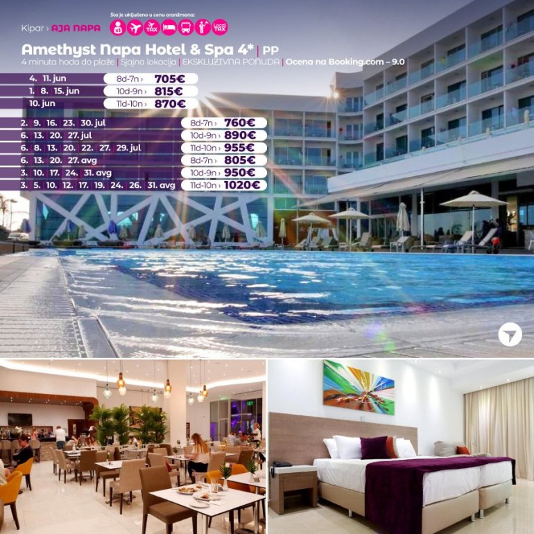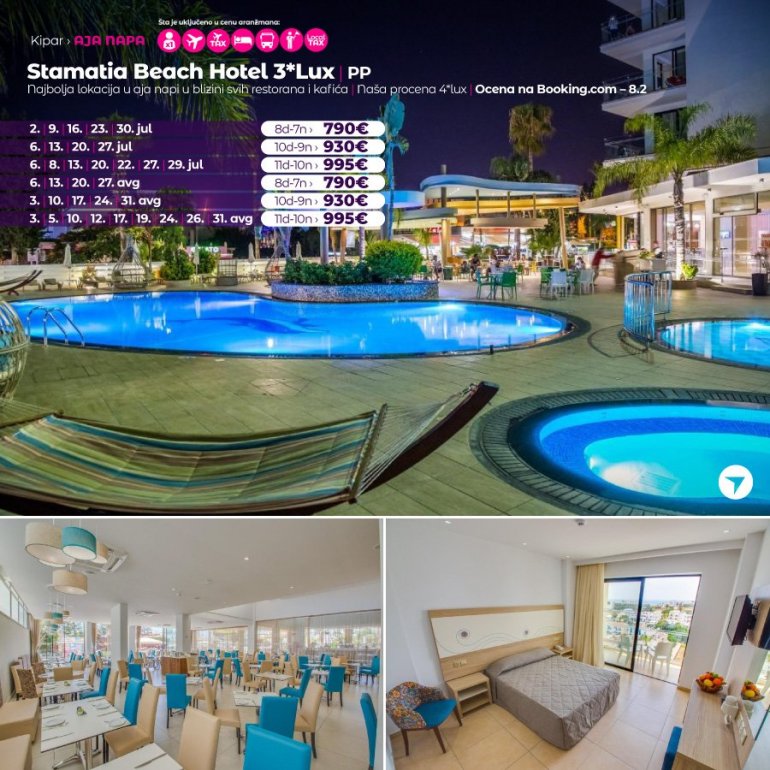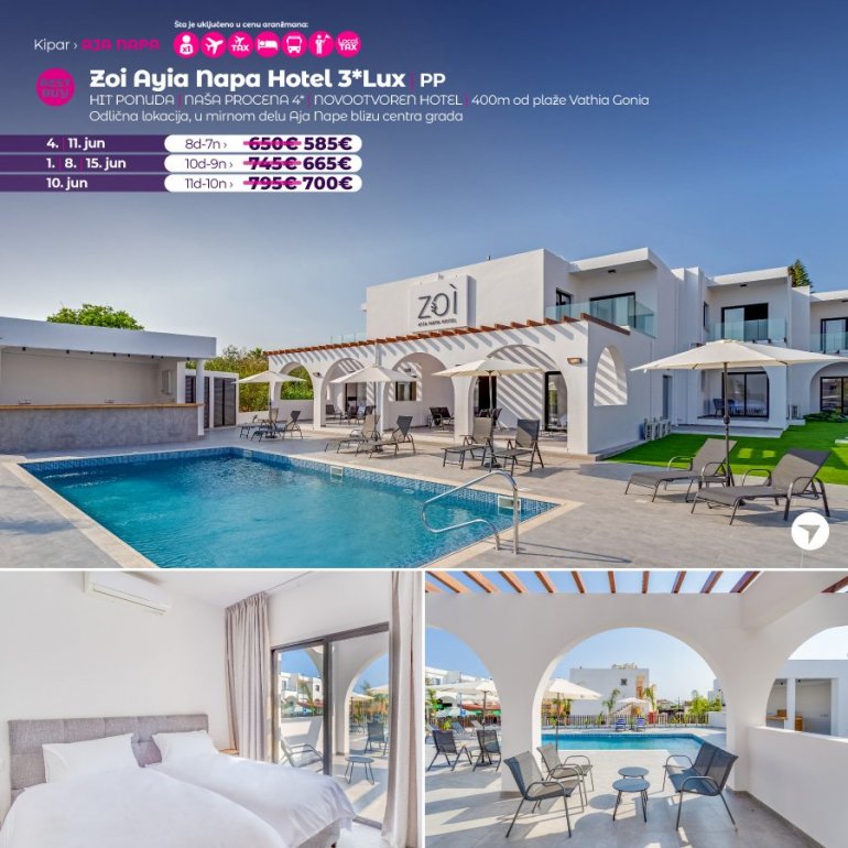 Predstavljamo vam hotel koji sredinom juna otvara svoja vrata za goste. U pitanju je potpuno nov hotel na odlicnoj lokaciji. Nalazi se u Aja Napi, na 15 minuta setnje od centra ovog mesta i u blizini plaze Vathia Gonia. U blizini hotela nalazi se brojni restorani, barovi i stanica gradskog prevoza. Hotel poseduje WiFi, bar kod recepcije, spoljasnji bazen i teretanu. Sobe su moderno opremljene, sa AC uređajem.