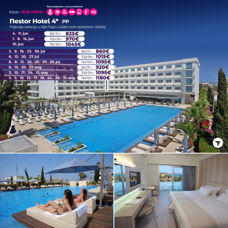 Moderan i u potpunosti renoviran hotel Nestor, odlično je pozicioniran na samo nekoliko minuta šetnje do prelepe peščane plaže, marine i centra Aja Nape. Visoko je ocenjen na turističkim potralima i dobitnik je prestižne plakete za visok kvalitet usluge. Hotel od sadržaja ima: veliki spoljašnji bazen sa masažerima, unutrašnji bazen, teretanu, saunu, parno kupatilo, stoni tenis, teniski teren, bilijar, frizerski salon, dnevnu i večernju animaciju za odrasle, sadržaje za decu – bazen, avantura park, rane obroke, animaciju, mini klub. Sobe su moderno opremljene, klimatizovane, imaju radio, fen, telefon, SAT LCD TV, frižider, sef, aparat za čaj i kafu, wi-fi internet (dostupan i besplatan u celom hotelu).