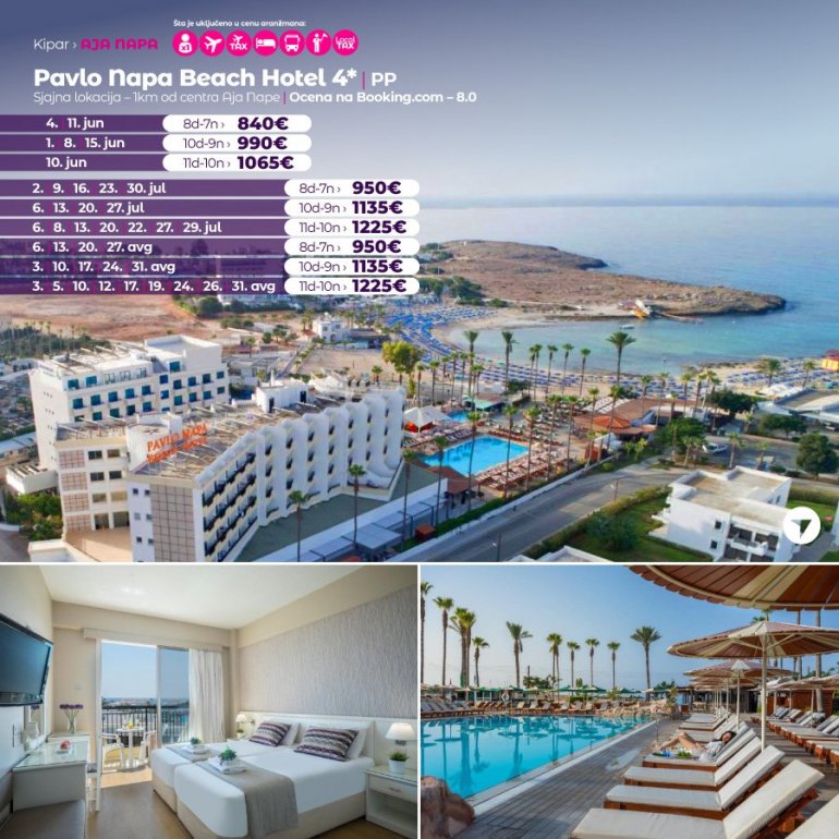Ovaj objekat je udaljen 1 min hoda od plaže. Hotel Pavlo Napa Beach je smešten na plaži u Aja Napi na Kipru. U ponudi ima opremljene balkone s kojih se pruža pogled na more i kopno i zatvoreni i otvoreni bazen sa ležaljkama i suncobranima.Sve klimatizovane sobe poseduju moderan nameštaj od drveta.