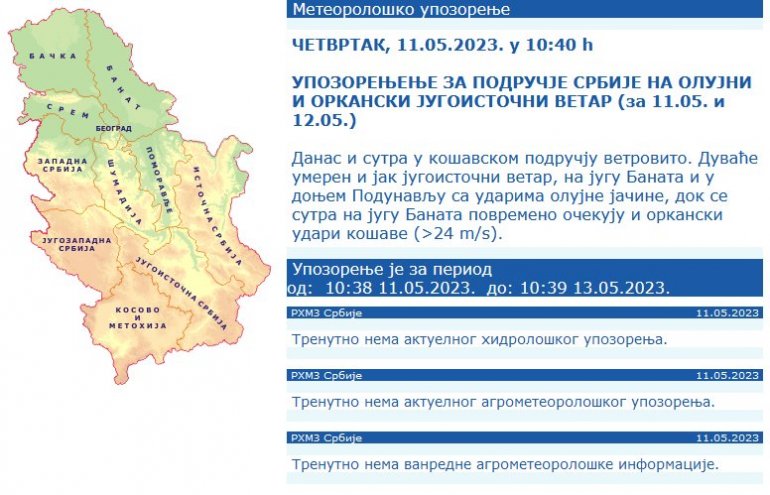 - Danas i sutra u košavskom području biće vetrovito. Duvaće umeren i jak jugoistočni vetar, na jugu Banata i u donjem Podunavlju sa udarima olujne jačine - navodi se u saopštenju.