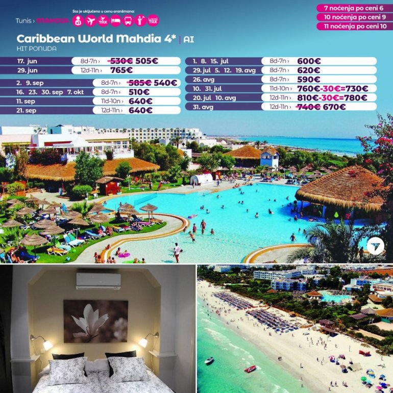 Caribbean World hotel smešten je u letovalištu sa najlepšim plažama – Mahdia. Od aerodroma u Monastiru udaljen je oko sat vremena i ima svoju plažu. Sobe su standardno opremljene, klimatizovane sa sopstvenim kupatilom i balkonom/terasom. U sklopu hotela je spoljni i unutrašnji bazen. Hotel poseduje restoran i bar. Dečiji klub namenjen za najmlađe je dostupan. Fitnes studio i teretana su takođe dostupni.