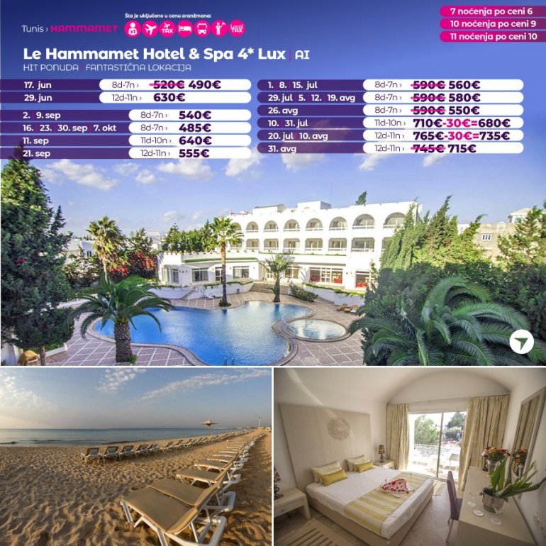 Isključivo sa AirSerbia u Tunis! 7 noćenja po ceni 6 noćenja / 10 noćenja po ceni 9 noćenja / 11 noćenja po ceni 10 noćenja. Izdvajamo iz ponude najtraženije hotele za leto 2023: