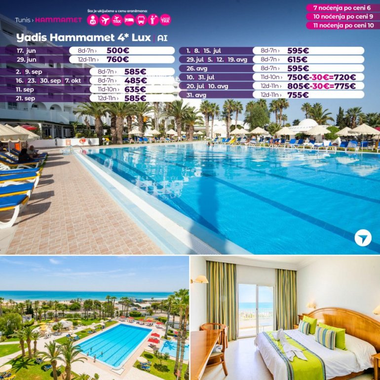 Smešten nadomak plaže sa finim peskom, hotel Yadis Hammamet vam želi dobrodošlicu u čuvenom letovalištu Hamamet. Hotel Yadis Hammamet sadrži 220 soba i apartmana. Sobe mogu primiti od 2 do 4 osobe i idealan su izbor za porodice ili grupe prijatelja. Sobe i apartmani su elegantni i nude sve neophodne sadržaje. Hotel Yadis Hammamet vam nudi glavni restoran, restoran na plaži u kome se služe mediteranski specijaliteti i 2 bara. Hotel nudi veliki izbor zabavnih aktivnosti, uključujući sportove, kurseve zanatskih veština i večernju zabavu.