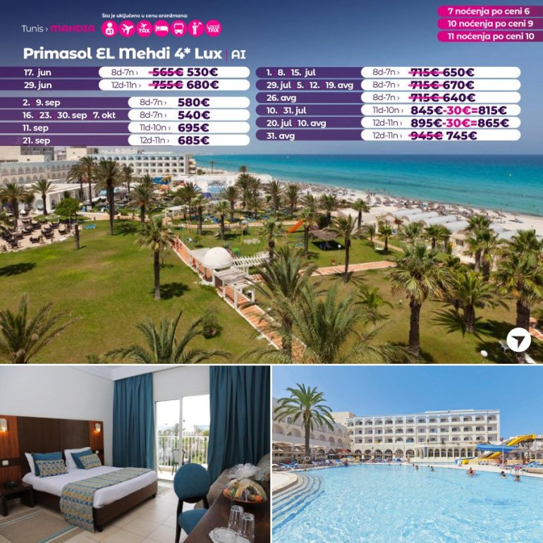 All-inclusive hotel Primasol El Mehdi se nalazi na 2 km od centra Mahdije i na 50 metara od privatne plaže, sa direktnim prilazom iz hotela. Hotel je na odličnoj lokaciji, u blizini starog dela grada. U sklopu hotela nalaze se četiri otvorena bazena i jedan zatvoreni. Za najmlađe tu je bazen sa nekoliko tobogana. Gosti mogu da uživaju uz odbojka na pesku, aerobik, fitness. Hotel poseduje spa i wellness koji se doplaćuju. Hotel ima svoju plažu. Suncobrani, ležaljke i peškiri su besplatni za korišćenje.
