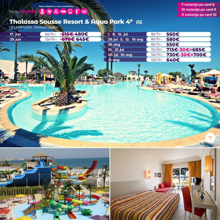 Thalassa Sousse resort & aquapark je all-inclusive hotel smešten na obodu prelepe plaže. Hotel je uređen u modernom i dizajnerskom stilu. Prostrane i udobne sobe sadrže klima-uređaj, telefon, fen za kosu i balkon ili terasu. Hotel Thalassa Sousse resort & aquapark poseduje 4 restorana, 6 barova, 5 bazena, mini-klub, teniski teren i mini-golf. Gostima nudi zabavni program za decu i odrasle, centar za balneoterapiju i salu za sastanke kapaciteta od 10 do 100 osoba. Hotel Thalassa Sousse resort & aquapark se nalazi u velikom vrtu koji se prostire na 14 hektara. Nalazi se na 16 km od aerodroma Monastir, 4 km od Medine u Susu i 7 km od luke El Kantaui.
