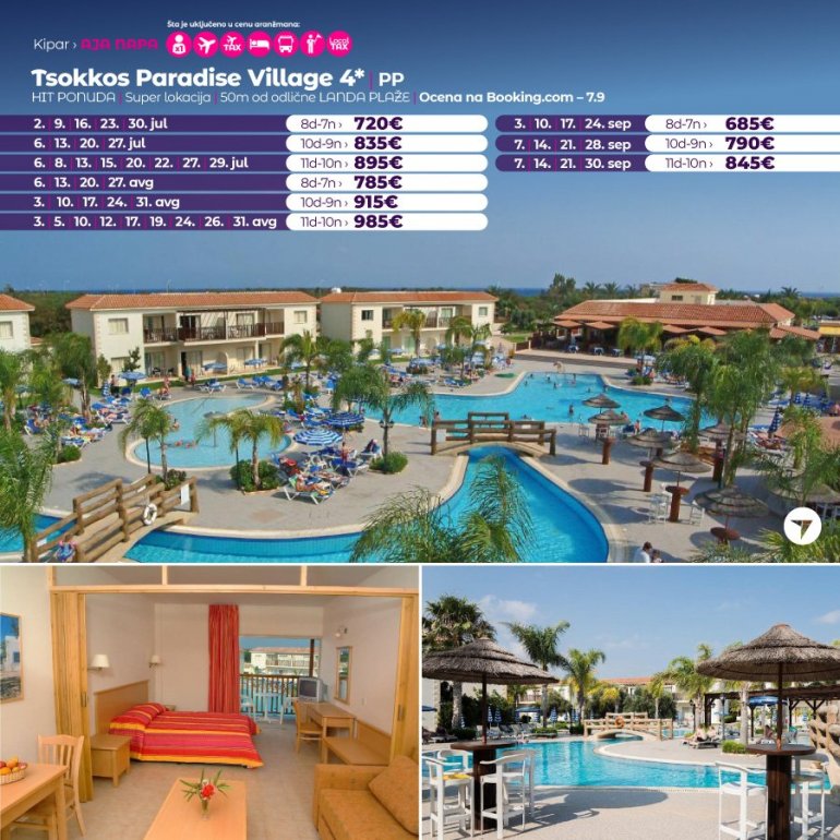 Ovo odmaralište sa 4 zvezdice nalazi se u letovalištu Aja Napa. Nudi zatvoreni bazen, fitnes centar, saunu i otvoreni bazen nepravilnog oblika, okružen nameštenom terasom za sunčanje. Sadržaji odmarališta Tsokkos Paradise takođe obuhvataju restoran-bar pored bazena, igraonicu sa bilijarom, teniski teren i mini-market.