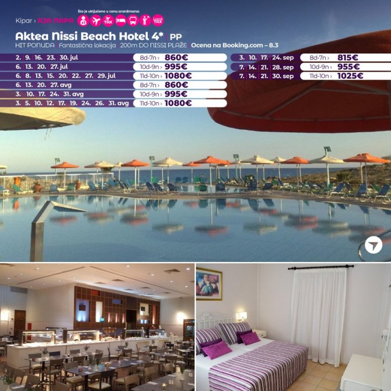 Nissiblu je nov, luksuzan hotel, otvoren pred sezonu 2019 god. Nalazi se u laguni Nisi plaže, najpoznatije plaže u Aja Napi, na oko 2 km od centra grada. Posle samo jedne sezone poslovanja, hotel je vrlo visoko ocenjen na turističkim portalima. Pohvale od strane zadovoljnih klijenata se, osim savršene lokacije, odnose i na izvanrednu hranu, atmosferu, udobne sobe i ljubazno, stručno osoblje. Hotel je preporuka naše agencije kako za parove, tako i za porodice sa decom.