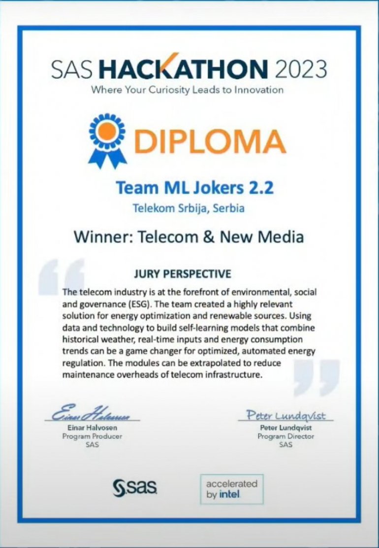 TELEKOM SRBIJA MEĐU POBEDNICIMA GLOBALNOG SAS HAKATONA: Priznanje za projekat u kategoriji „telekomunikacije i novi mediji“