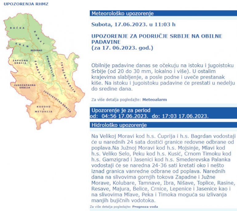 - Na istoku i jugoistoku padavine će prestati u nedelju do sredine dana - piše na sajtu Republičkoh hidrometeorološkog zavoda. Takođe je izdato i hidrološko upozorenje.