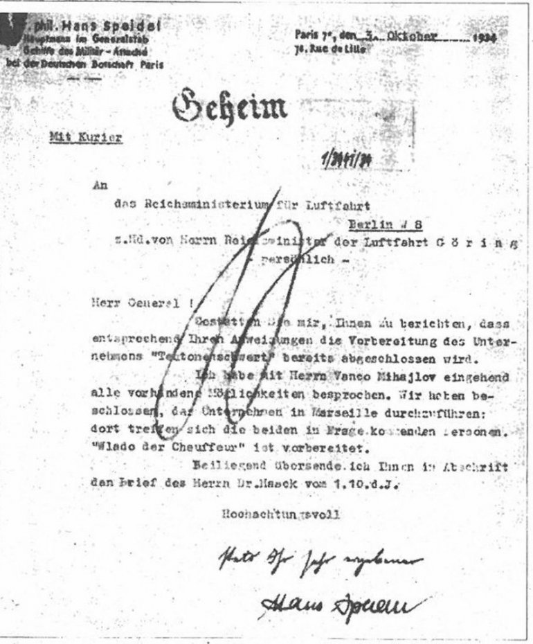 Pismo sa svojeručnim Geringovim potpisom i određenim direktivama bilo je po specijalnom kuriru dostavljeno Špajdelu u Pariz. Pečat ambasade i oznaka "3. 9. '34" pokazuju da je ono stiglo primaocu tri dana posle odašiljanja.