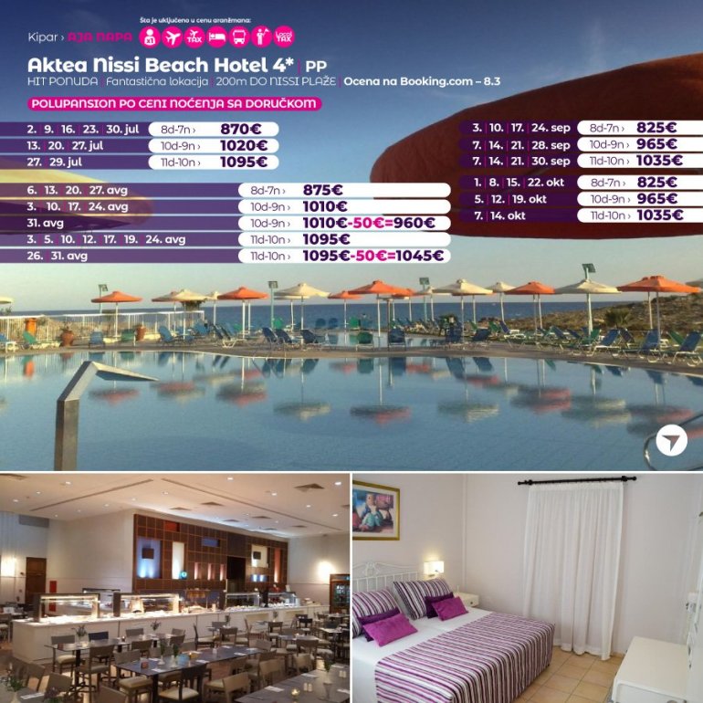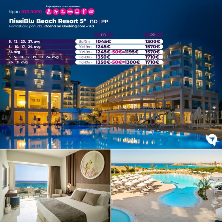 Nissiblu Beach Resort 5* je nov, luksuzan hotel, otvoren pred sezonu 2019 god. Nalazi se u laguni Nisi plaže, najpoznatije plaže u Aja Napi, na oko 2 km od centra grada. Posle samo jedne sezone poslovanja, hotel je vrlo visoko ocenjen na turističkim portalima. Pohvale od strane zadovoljnih klijenata se, osim savršene lokacije, odnose i na izvanrednu hranu, atmosferu, udobne sobe i ljubazno, stručno osoblje. Hotel je preporuka naše agencije kako za parove, tako i za porodice sa decom.