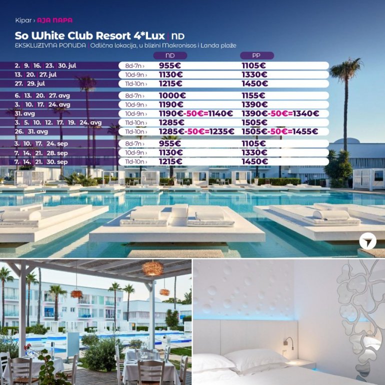 Objekat So White Club Resort 5* nalazi se na predivnoj Zlatnoj plaži u letovalištu Aja Napa. U ponudi su bazen u stilu lagune sa plutajućim ležaljkama i nagrađivani restoran. Ovaj butik hotel u Aja Napi je dizajnirao jedan od najboljih 50 dizajnera na svetu. Pored zadivljujućih tropskih vrtova nalazi se potpuno beo bazen, koji može menjati boje, sa jedinstvenim efektom neba u pozadini. Na plaži su dostupni sportovi na vodi, gnjuranje i ronjenje. Kosmopolitski centar noćnog života Aja Nape nalazi se na samo 3,5 km od hotela i do njega se lako i brzo stiže autobusom i taksijem.
