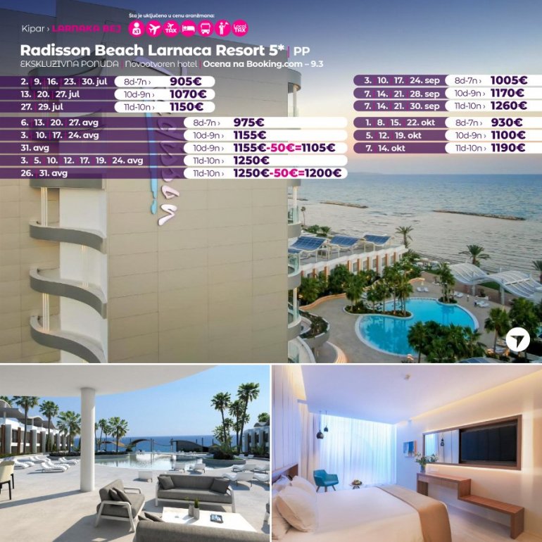 Radisson Beach Resort Larnaca 5* - Hotel se nalazi u Larnaki, na peskovitoj plaži koja je ponosni vlasnik plave zastavice za kvalitet. Od Marine u Larnaki udaljen je oko 6km, dok je od centra Larnake udaljen 7km. U pitanju je novootvoren hotel sa 202 elegantno i moderno uređene sobe, a ceo kompleks odiše luksuzom. U sklopu hotela nalazi se bazen, restoran i barovi. Preporučuje se za sve tipove gostiju.
