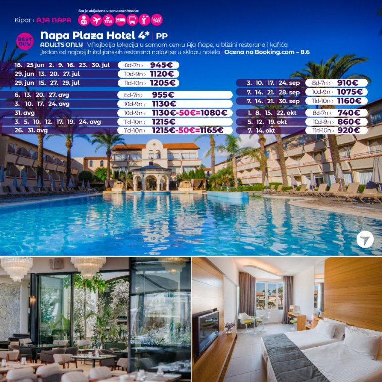 Napa Plaza Hotel (Adults Only) 4* - Ovo je moderan i atraktivan hotel sa četiri zvezdice u srcu Aja Nape. Namenjen je samo odraslim gostima, a izgrađen je 1989. godine u blizini srednjovekovnog manastira. Ovaj centralno locirani savremeni i jedinstveni hotel koji je sagrađen u stilu trga nudi gostima privatnost, prefinjenost i personalizovanu uslugu, što se i očekuje od višestruko nagrađivanog sofisticiranog okruženja prilagođenog odraslima. Hotel je udaljen 7 minuta hoda od najbliže gradske plaže, kilometar od popularne Grecian bay plaže, 3 km od Nissi plaže i 4,5 km do Waterworld vodenog parka. Objekat se nalazi u samom centru Aja Nape, okružen prodavnicama, kafićima i restoranima. Autobuska stanica i stari Manastir su u neposrednoj blizini, a nedaleko su i muzej Thalassa, podvodni muzej Musan, park skulptura i kaktusa.