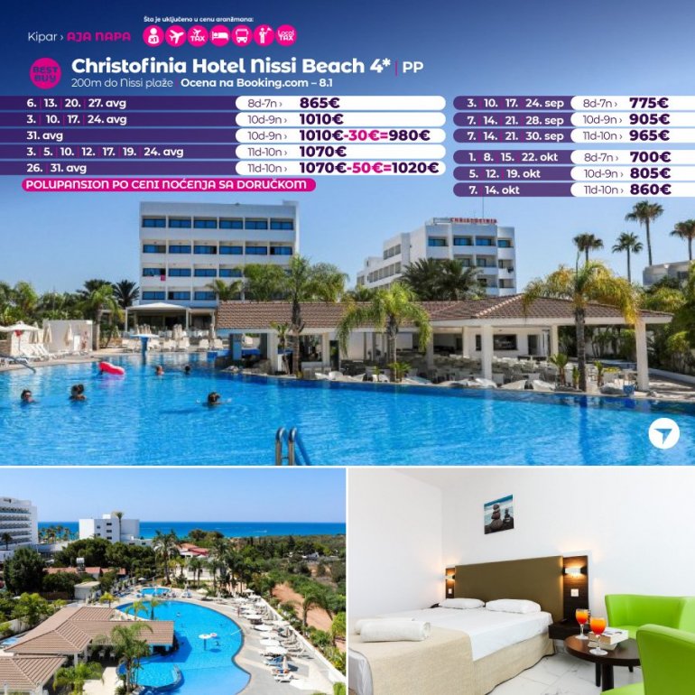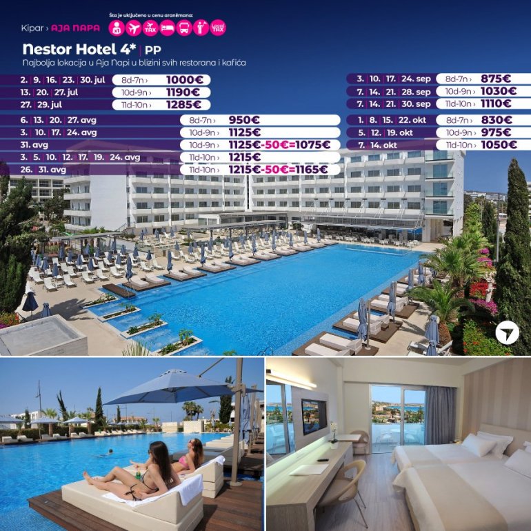 Nestor Hotel 4* - Moderan i u potpunosti renoviran hotel Nestor, odlično je pozicioniran na samo nekoliko minuta šetnje do prelepe peščane plaže, marine i centra Aja Nape. Visoko je ocenjen na turističkim potralima i dobitnik je prestižne plakete za visok kvalitet usluge. Hotel od sadržaja ima: veliki spoljašnji bazen sa masažerima, unutrašnji bazen, teretanu, saunu, parno kupatilo, stoni tenis, teniski teren, bilijar, frizerski salon, dnevnu i večernju animaciju za odrasle, sadržaje za decu – bazen, avantura park, rane obroke, animaciju, mini klub. Sobe su moderno opremljene, klimatizovane, imaju radio, fen, telefon, SAT LCD TV, frižider, sef, aparat za čaj i kafu, wi-fi internet (dostupan i besplatan u celom hotelu).