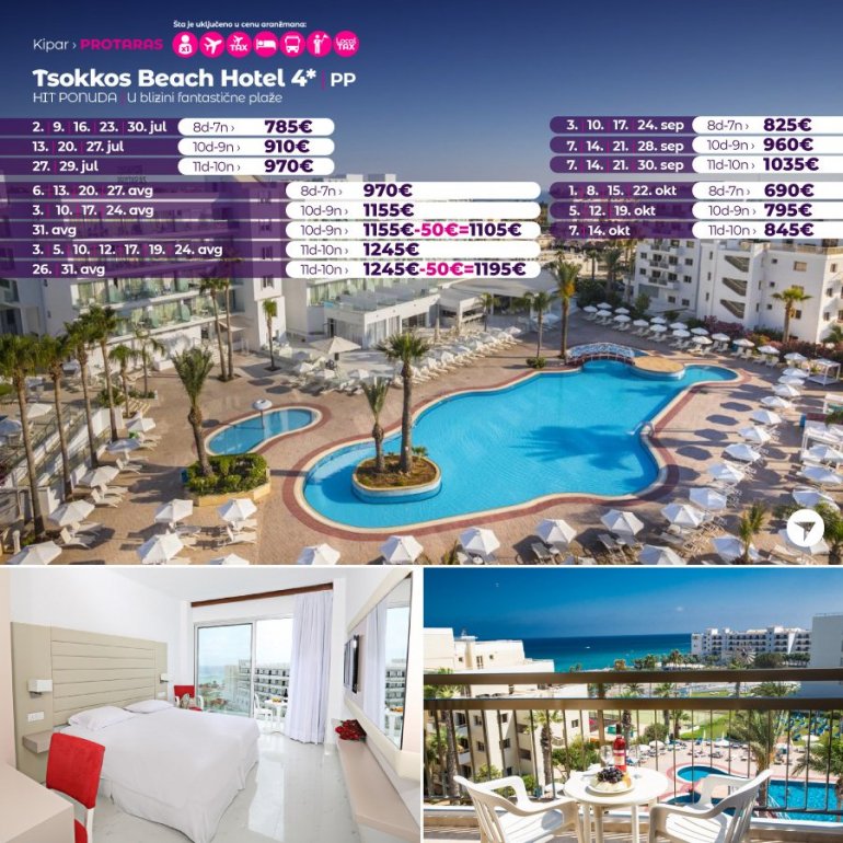 Na samo 150 m od plaže, u centru Protarasa, nalazi se hotel Tsokkos Beach Hotel 4*. Okružen je mnogobrojnim restoranima, prodavnicama i barovima, a pešačka staza uz more prolazi ispred hotela. Osim glavnog restorana, u kome se služe obroci po principu švedskog stola, hotel ima i kafetriju, bar na bazenu, bazen za odrasle, bazen za decu, salu za video igrice, teretanu, animaciju tokom dana i večeri, teniski teren. Sve sobe su moderno opremljene, uz doplatu je bežični internet, korišćenje elektronskog sefa i mini frižidera.
