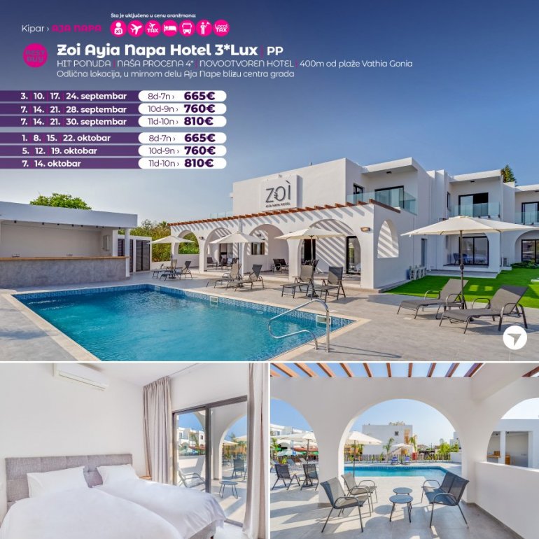 Zoi Hotel 4* - Predstavljamo vam hotel koji sredinom juna otvara svoja vrata za goste. U pitanju je potpuno nov hotel na odlicnoj lokaciji. Nalazi se u Aja Napi, na 15 minuta setnje od centra ovog mesta i u blizini plaze Vathia Gonia. U blizini hotela nalazi se brojni restorani, barovi i stanica gradskog prevoza. Hotel poseduje WiFi, bar kod recepcije, spoljasnji bazen i teretanu. Sobe su moderno opremljene, sa AC uređajem.