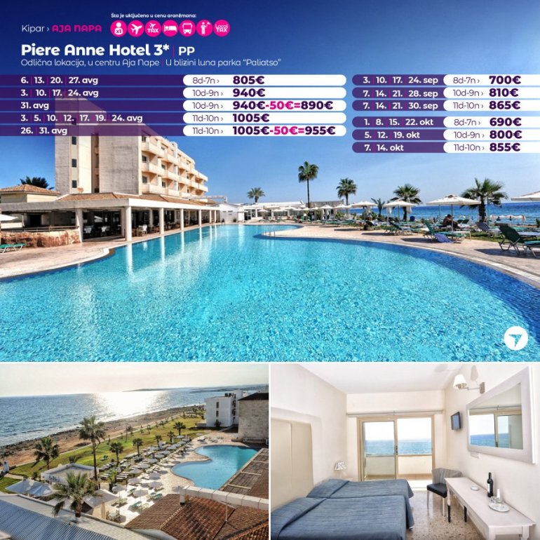 Hotel Piere Anne 3*Lux ima odličnu lokaciju na obali mora, na 5 minuta od centra Aja Nape i na 5 minuta od luke i plaže. Zabavni park Parko Paliatso Fun se takođe nalazi odmah iza hotela, zajedno sa čuvenom ulicom Nissi Avenue. U neposrednoj blizini nalaze se prodavnice, barovi i restorani, a svi sadržaji Aja Nape su na dohvat ruke. Hotel Piere Anne se sastoji od 3 bloka soba sa 2 velika otvorena bazena.Bazeni imaju direktan pristup stazi uz more, a bar pored bazena "En Plo" je odlično mesto za opuštanje tokom dana. Iako hotel nema mnogo sadržaja na licu mesta, Piere Anne je toliko blizu svega u Aja Napi da je odlična baza za zabavu na plaži ili provod u klubovima, kao i odmor uz Mediteran.