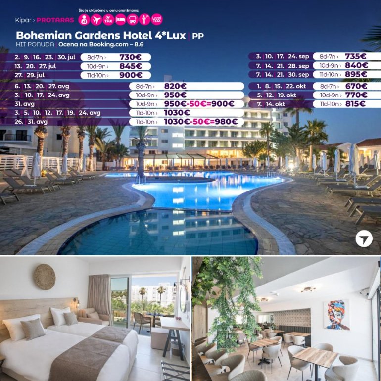 Bohemian Gardens 4* - Hotel je smešten u blizini Marlita Bay, u delu Protarasa koji se zove Pernera – jedan od najživljih delova ovog grada. Bohemian Gardens Hotel sa 4* je zgrada sa 5 spratova, sa 133 sobe i 8 bungalova. Hotel je otvoren u julu 2020. godine i uređen je u boho stilu.